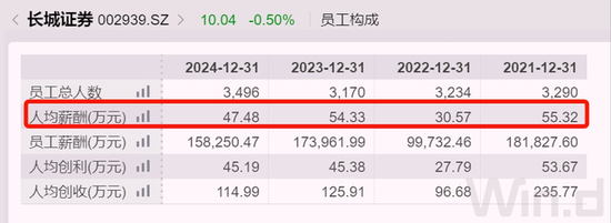 至2024年末,长城证券职工总数大约3500人,当年人均创利45万元,人均税前薪酬47.5万元,比2023年减少大约6.5万元,比2022年则大幅增加17万元。